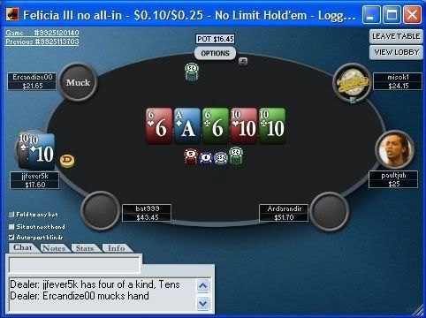i guess this guy was probably trying to trap or get in a CR with TPTK...it's a pretty nice flop for AK. wicked gold free card. not sure if i should have raised the turn here. i probably could have bet more on the river. i may need to start playing my big hands bigger.